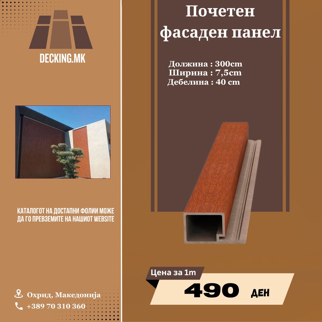WPC (Wood-Plastic Composite) фасадните панели претставуваат современо и одржливо решение за обложување на надворешни ѕидови. Со 10-годишна гаранција, овие панели се дизајнирани да траат многу подолго од гаранцискиот рок, без промена на бојата, обликот или функционалноста.