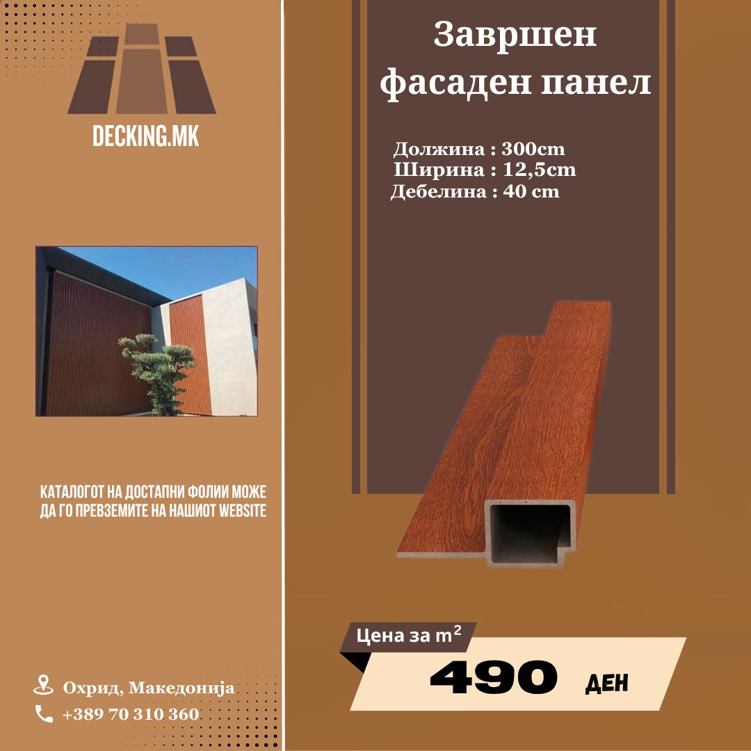 WPC (Wood-Plastic Composite) фасадните панели претставуваат современо и одржливо решение за обложување на надворешни ѕидови. Со 10-годишна гаранција, овие панели се дизајнирани да траат многу подолго од гаранцискиот рок, без промена на бојата, обликот или функционалноста.